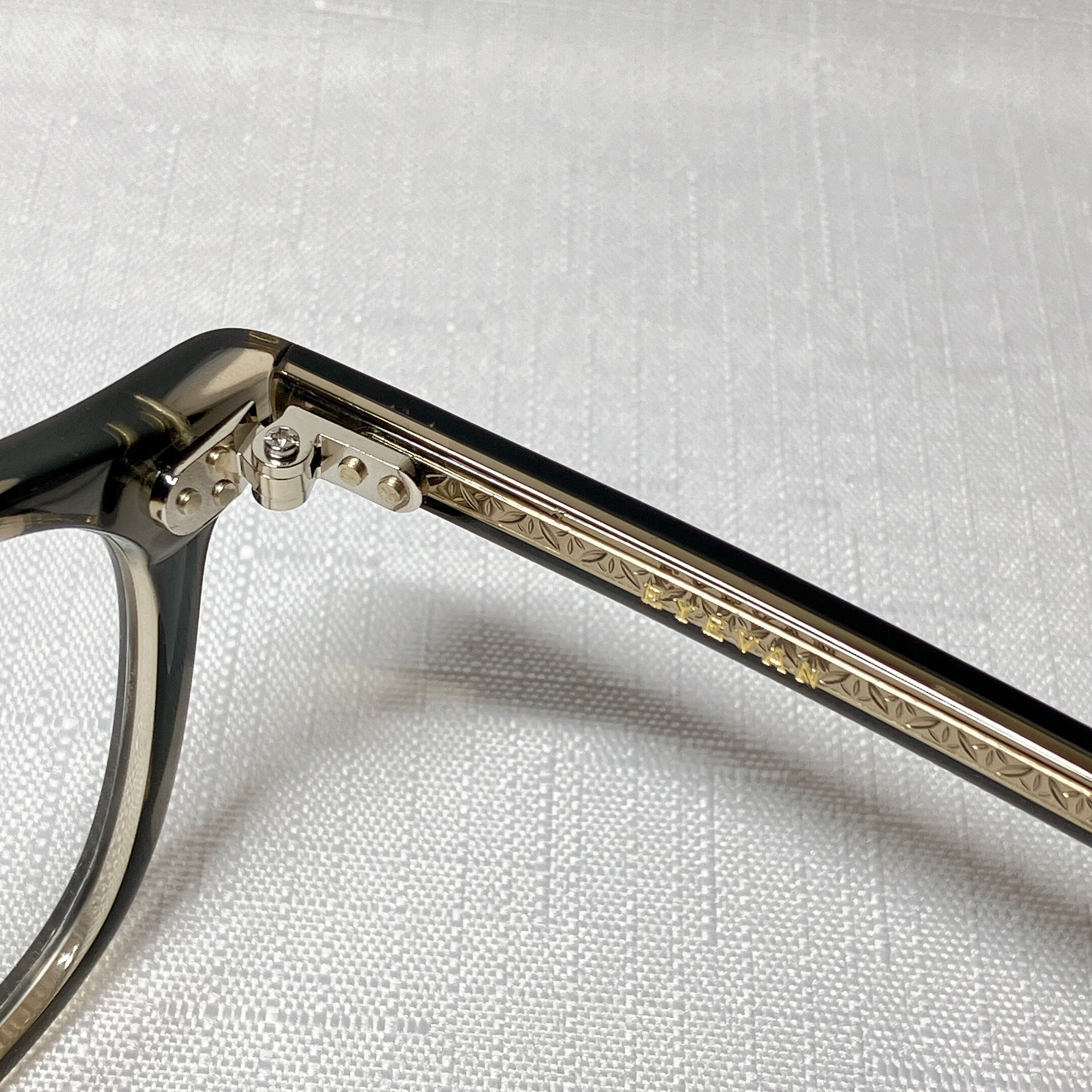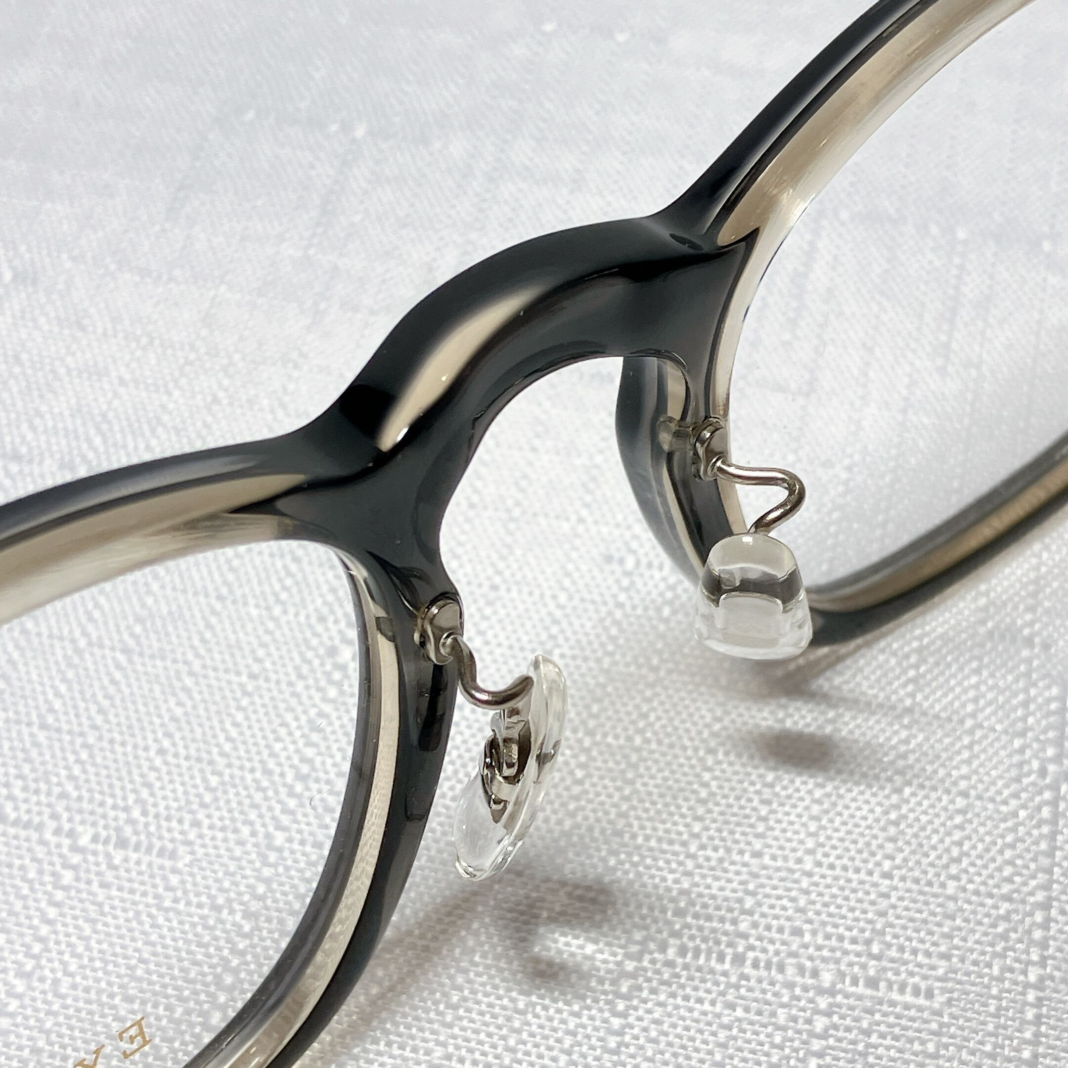 “Sadler narrow”にクリングスアームを採用した COMFORTABLE PAD MODEL“Sadler narrow-CP”。フロントデザインは、フレンチヴィンテージの雰囲気はそのままに0.1mm単位で再度設計し、テンプルは1950年代のハンドメイドフレームをモチーフに、このモデルに合わせて一からデザインした。丁番にはデザインとしても美しい置き丁番を採用するなど、細部までEYEVANらしさを表現したモデルとなった。