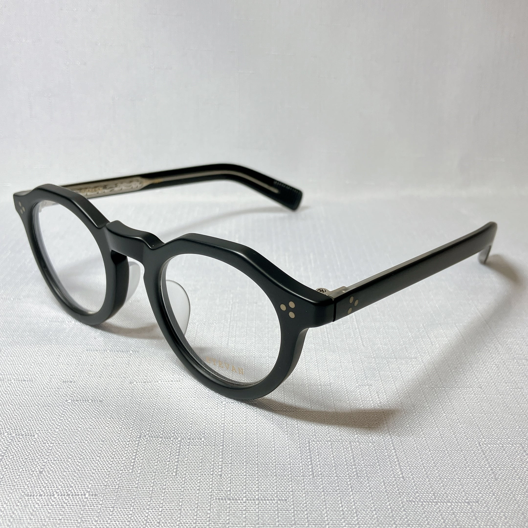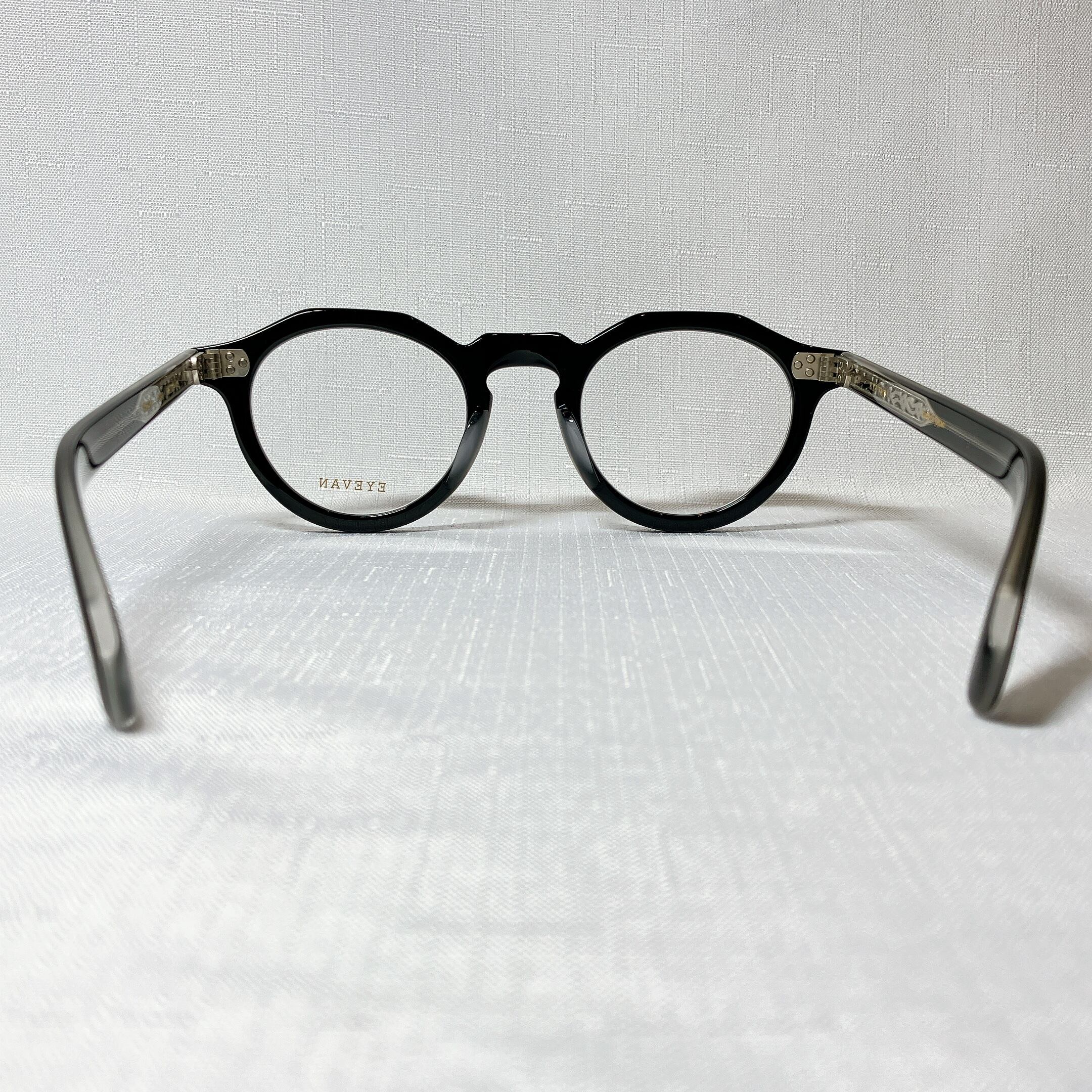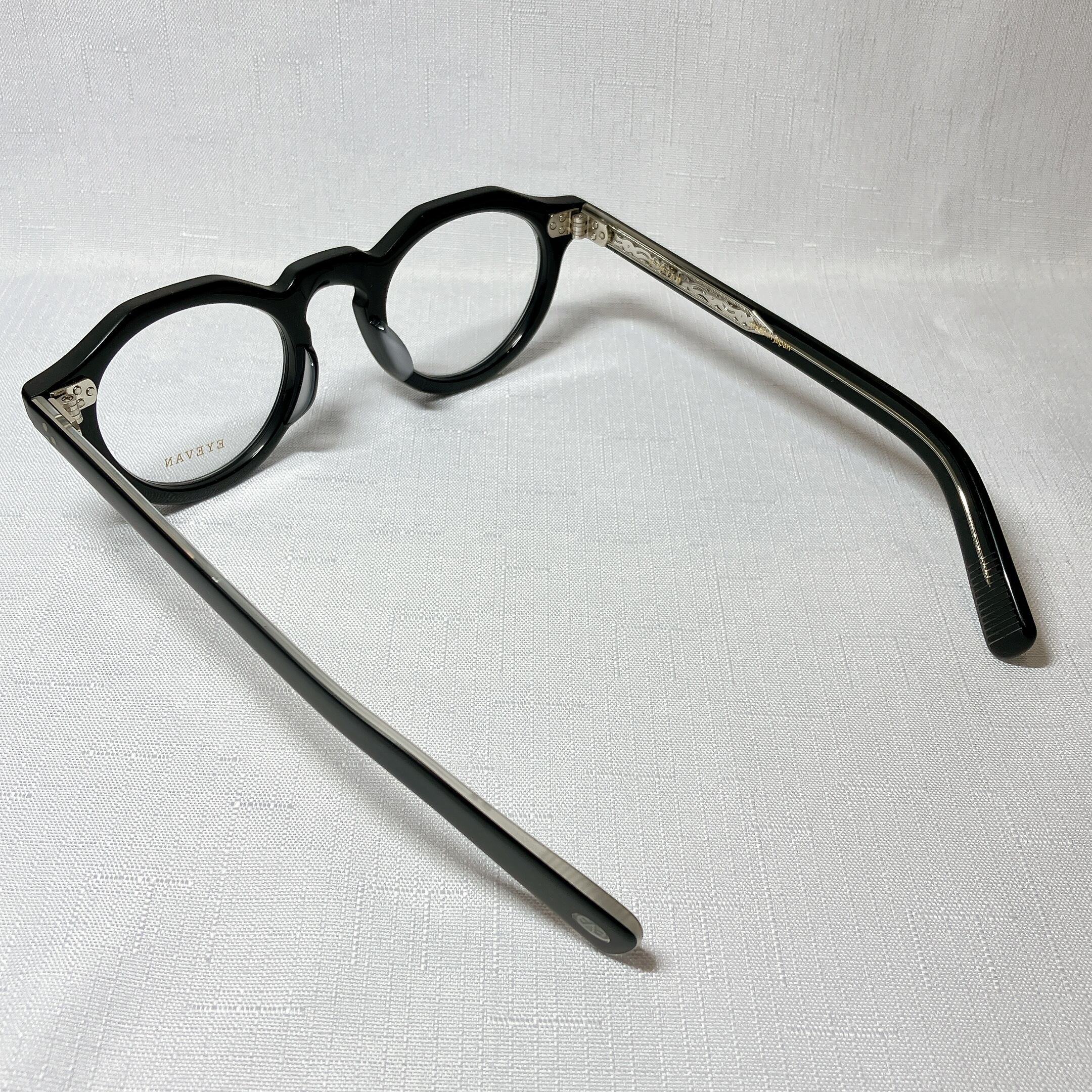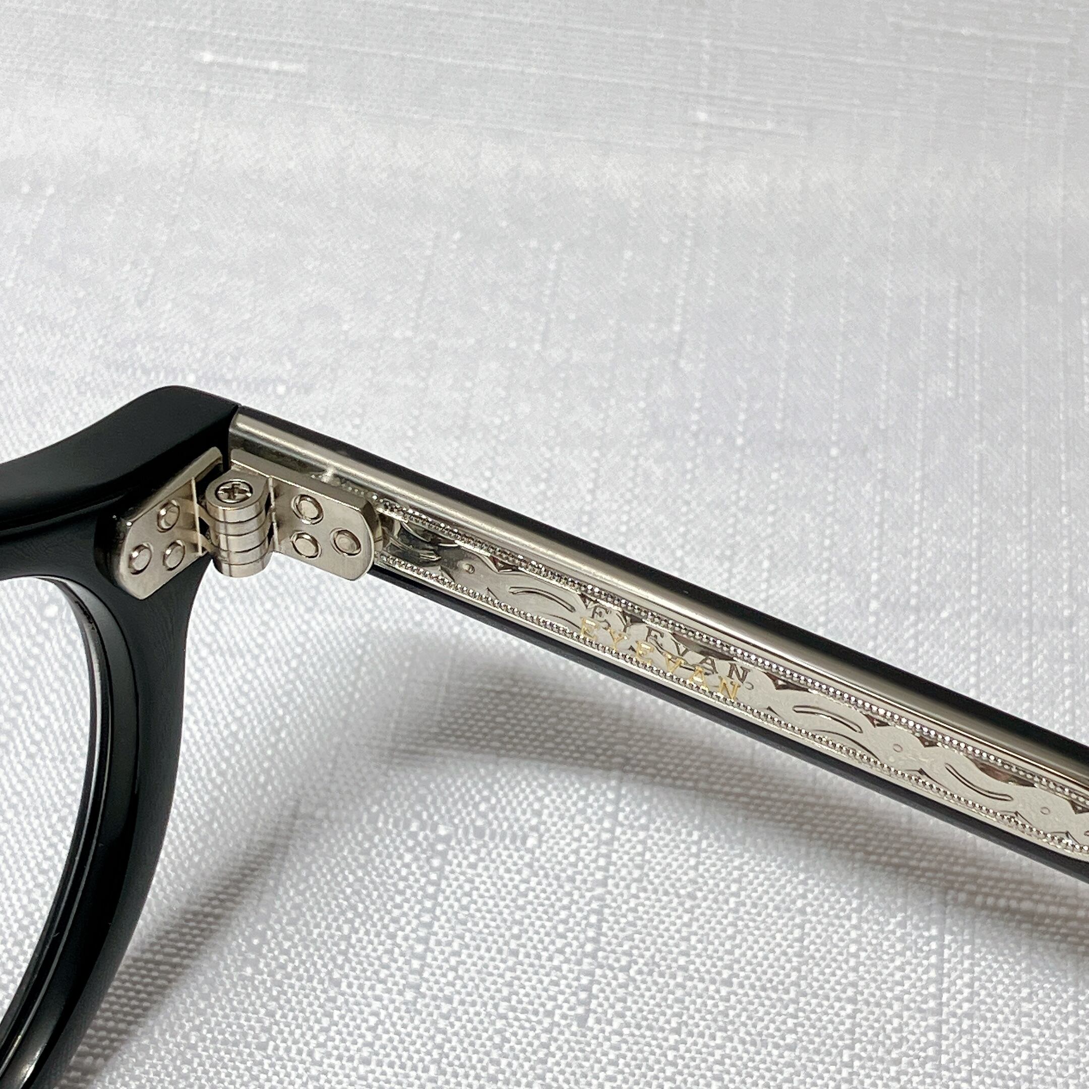 EYEVANが考えるフレンチヴィンテージを、エッヂのある肉厚なフロントと極太なワイドテンプルによって表現したモデル。フロント、テンプル丁番は60sのデザインをオリジナルで再現し、製法も置き丁番でのカシメ技法を採用。極力カシメのPINが見えないデザインにするなど細部まで忠実にヴィンテージの ディテールにこだわった。