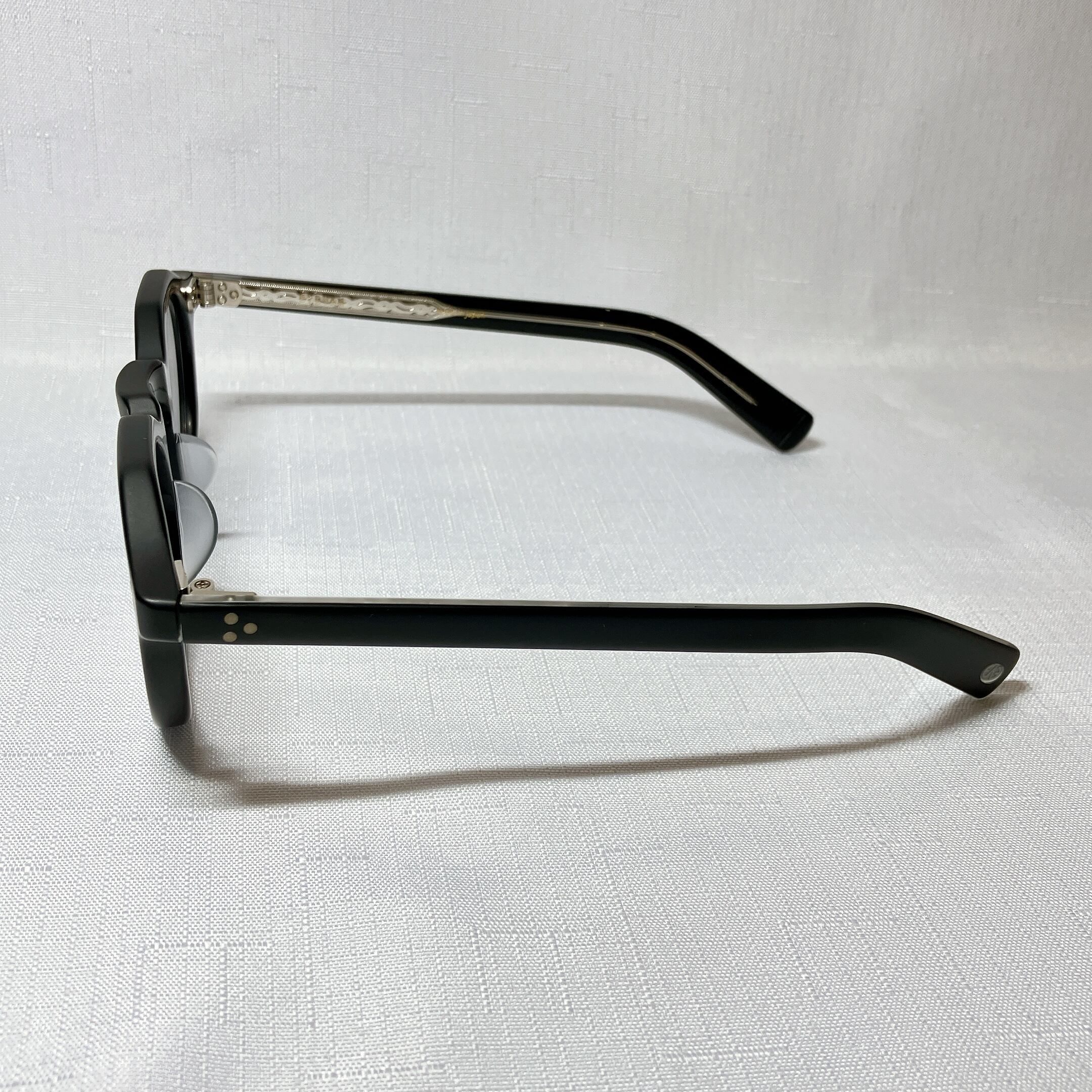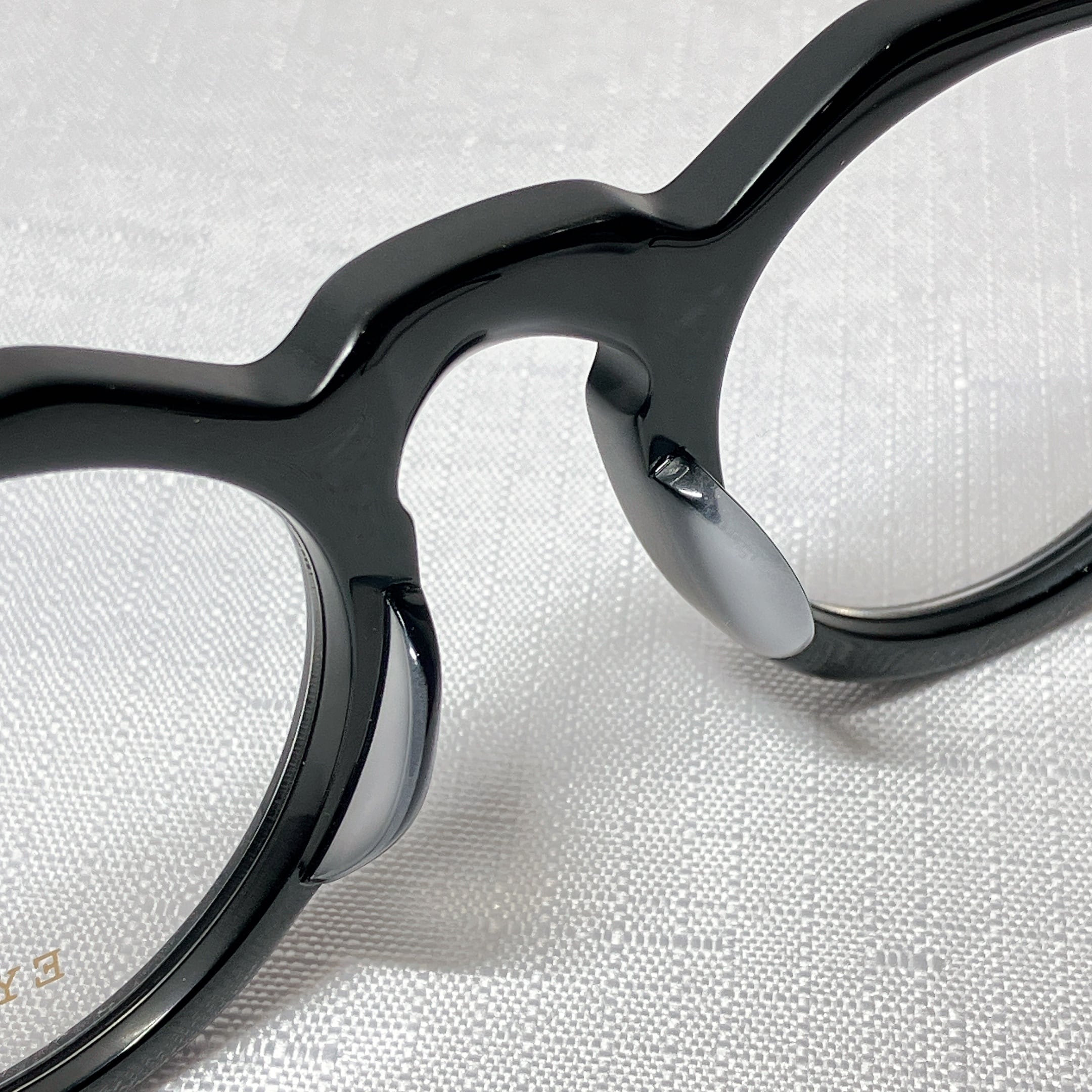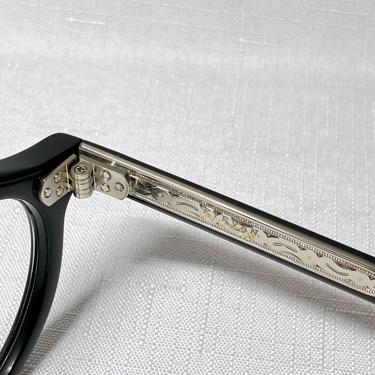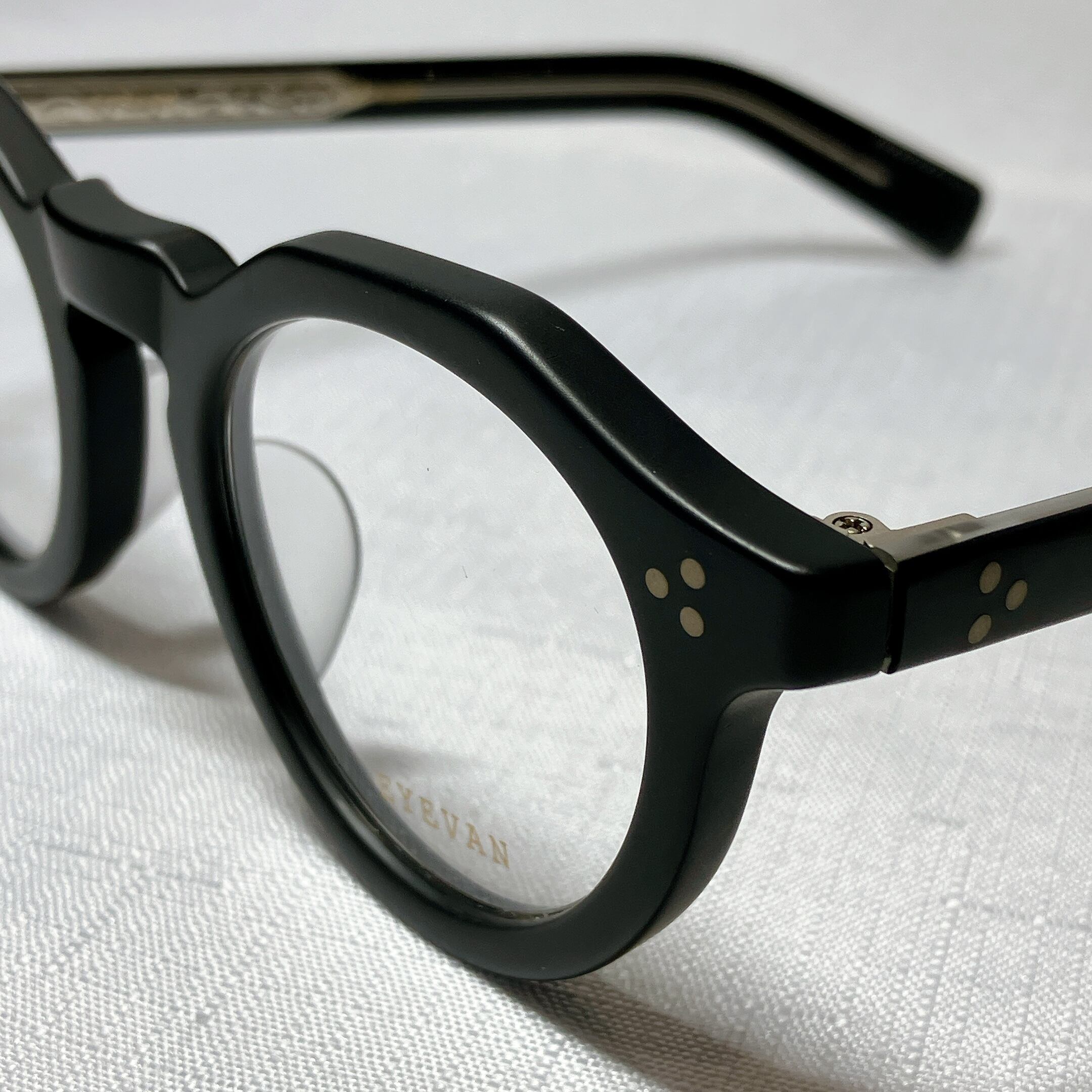 EYEVANが考えるフレンチヴィンテージを、エッヂのある肉厚なフロントと極太なワイドテンプルによって表現したモデル。フロント、テンプル丁番は60sのデザインをオリジナルで再現し、製法も置き丁番でのカシメ技法を採用。極力カシメのPINが見えないデザインにするなど細部まで忠実にヴィンテージの ディテールにこだわった。