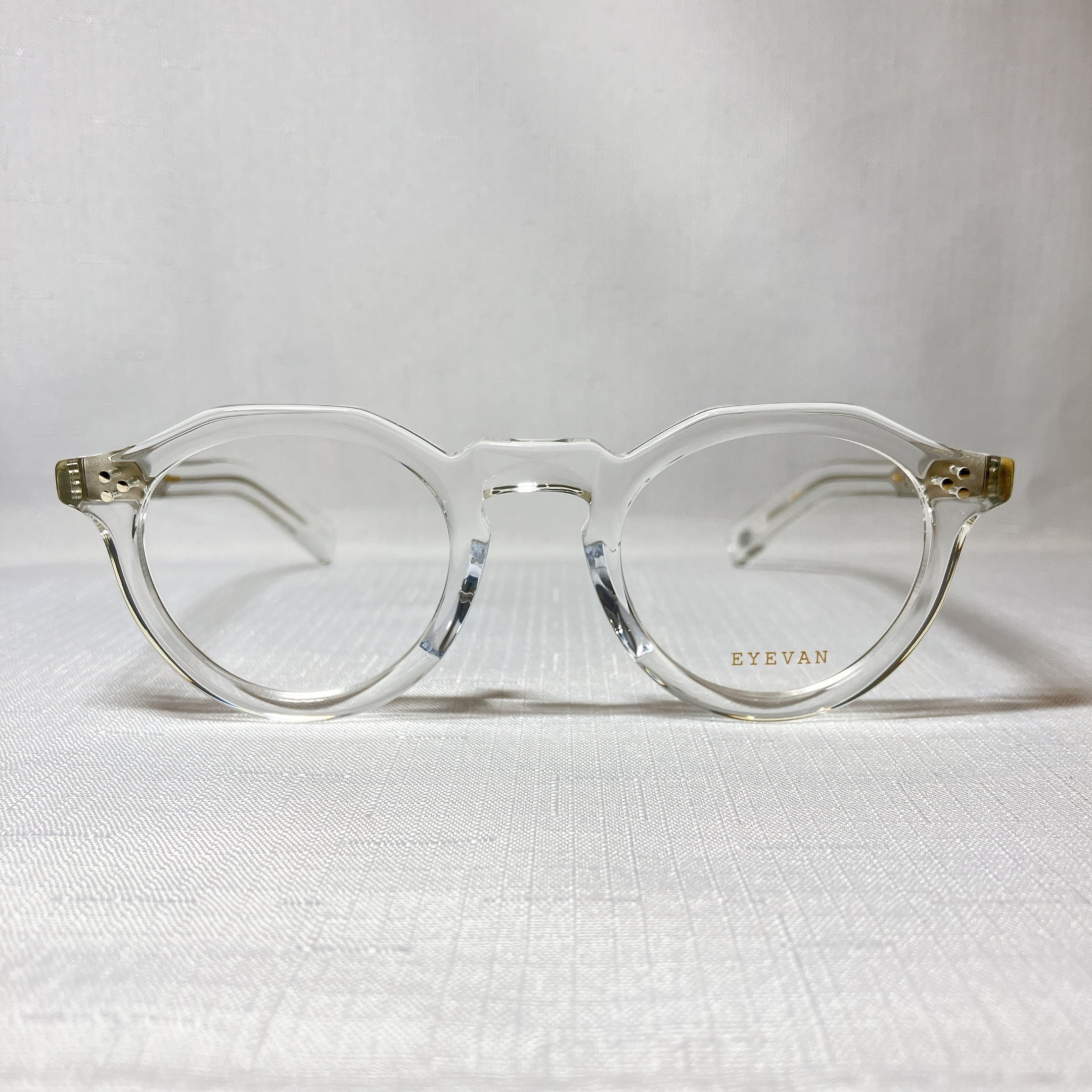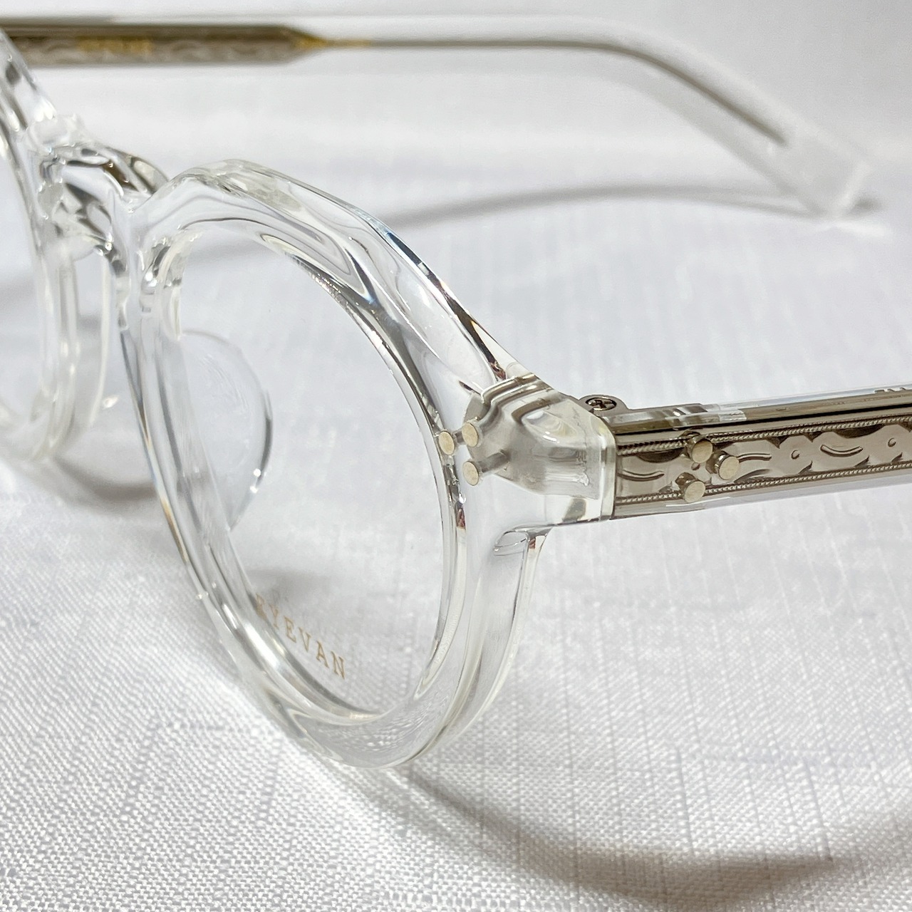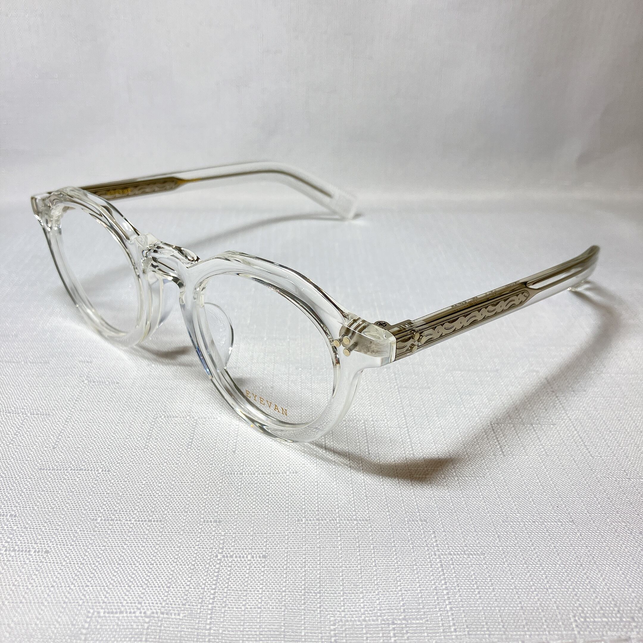 EYEVANが考えるフレンチヴィンテージを、エッヂのある肉厚なフロントと極太なワイドテンプルによって表現したモデル。フロント、テンプル丁番は60sのデザインをオリジナルで再現し、製法も置き丁番でのカシメ技法を採用。極力カシメのPINが見えないデザインにするなど細部まで忠実にヴィンテージの ディテールにこだわった。