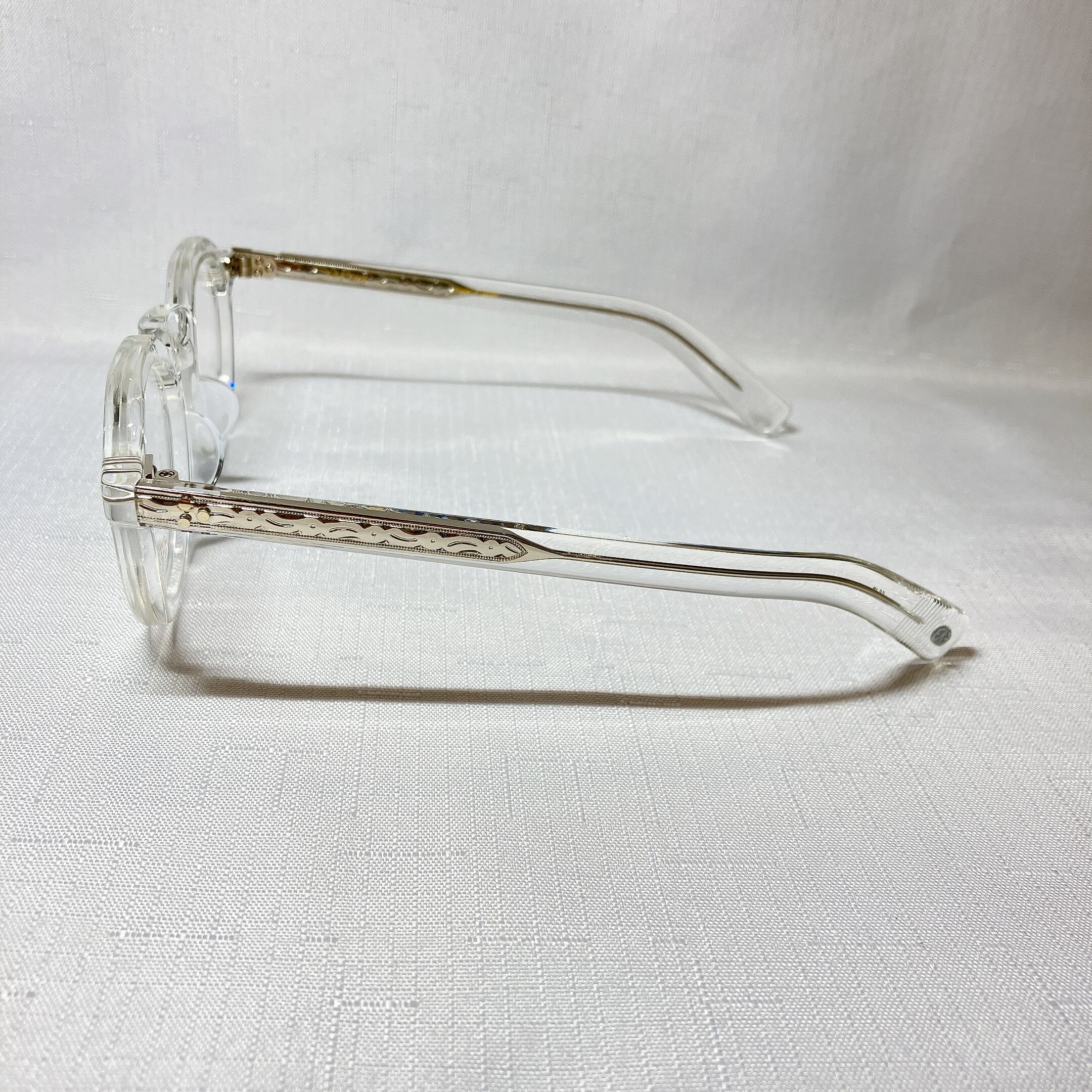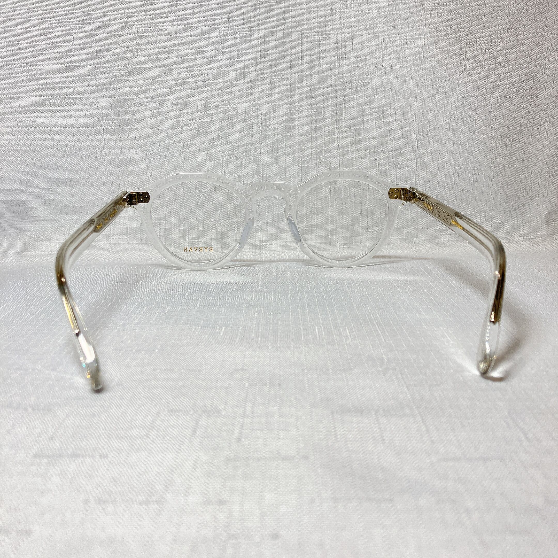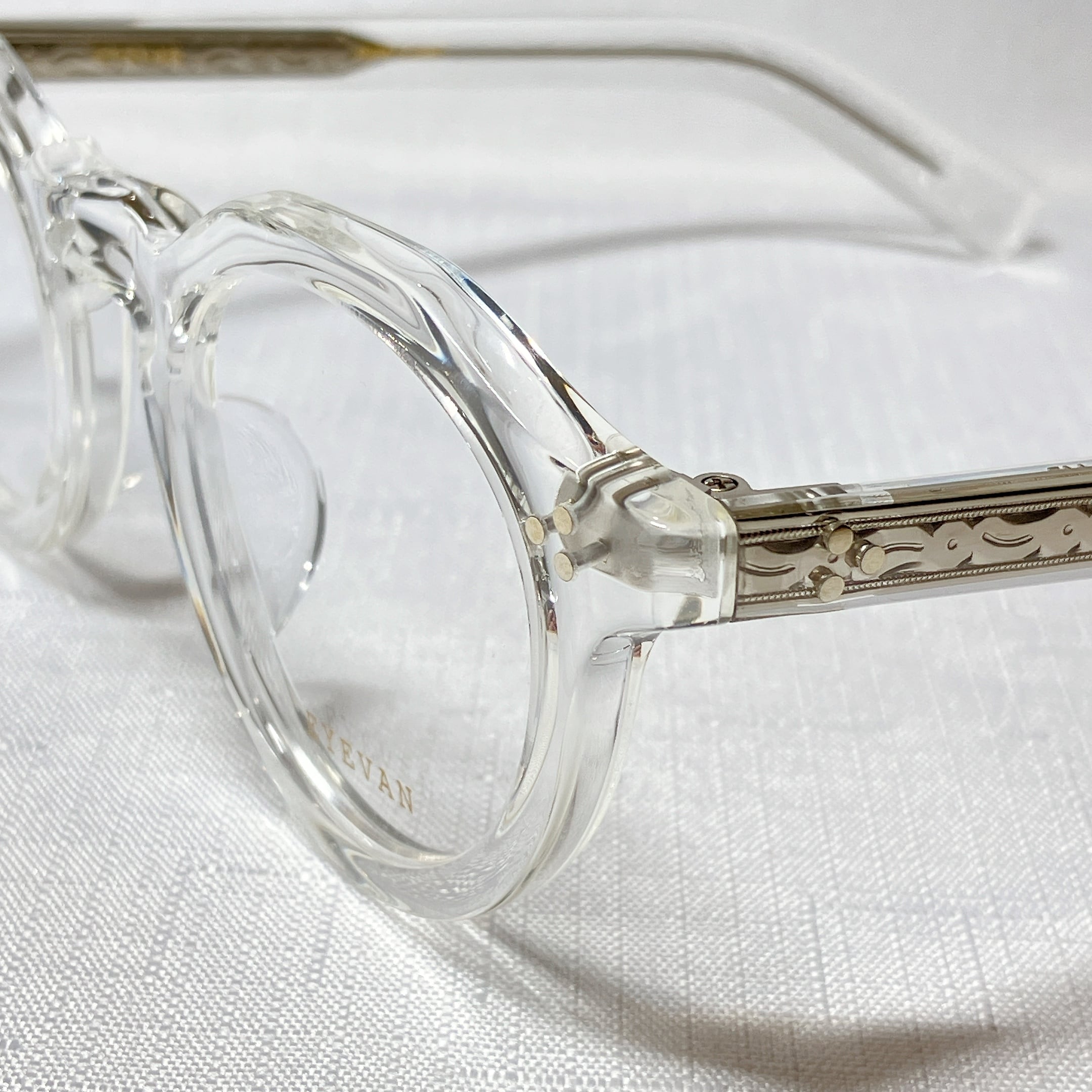 EYEVANが考えるフレンチヴィンテージを、エッヂのある肉厚なフロントと極太なワイドテンプルによって表現したモデル。フロント、テンプル丁番は60sのデザインをオリジナルで再現し、製法も置き丁番でのカシメ技法を採用。極力カシメのPINが見えないデザインにするなど細部まで忠実にヴィンテージの ディテールにこだわった。