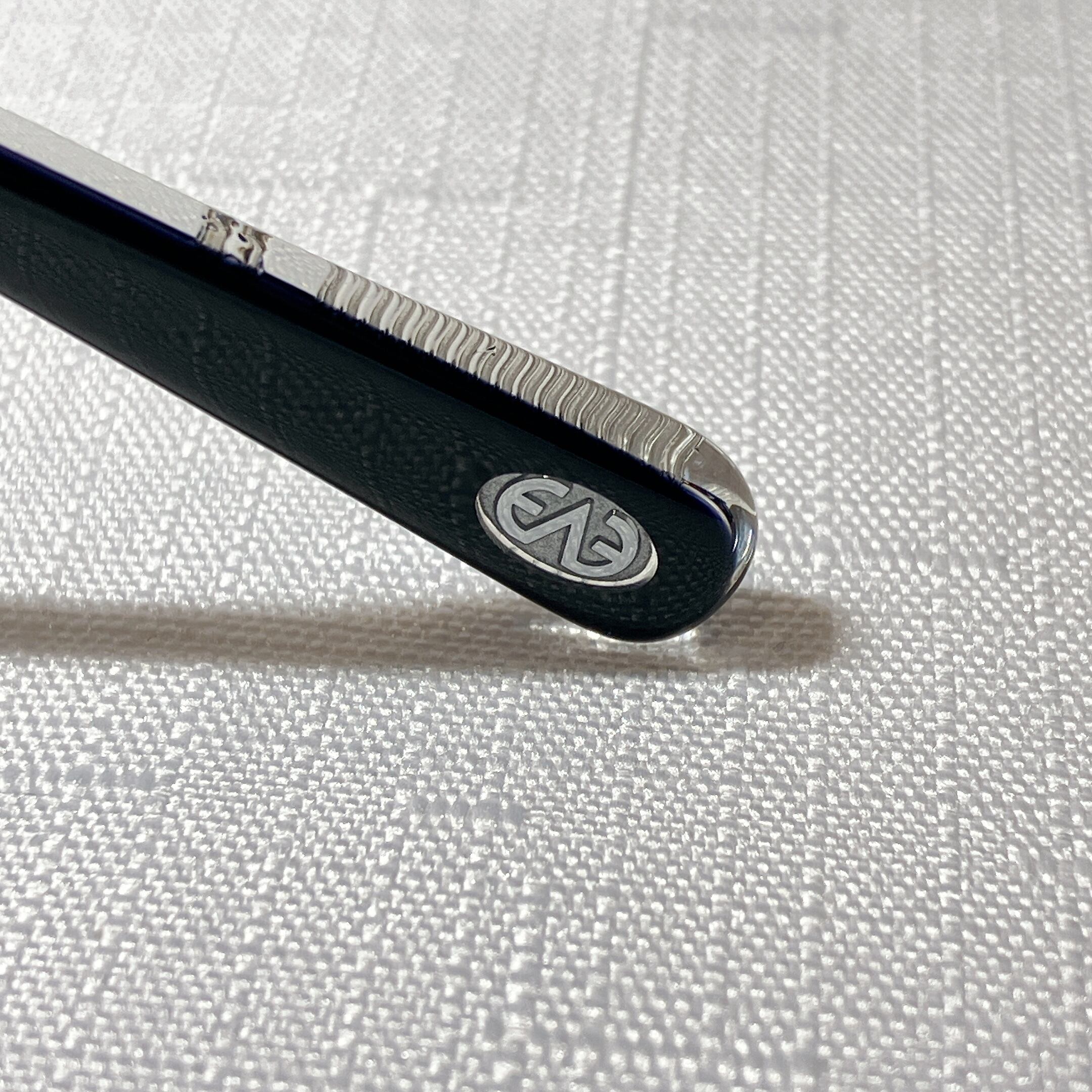 テンプル芯には、クラシックカーのパーツからインスパイアされた柄を表裏に彫り込んだオリジナル芯を使い、シンプルな中にもEYEVANらしい世界観を表現した。