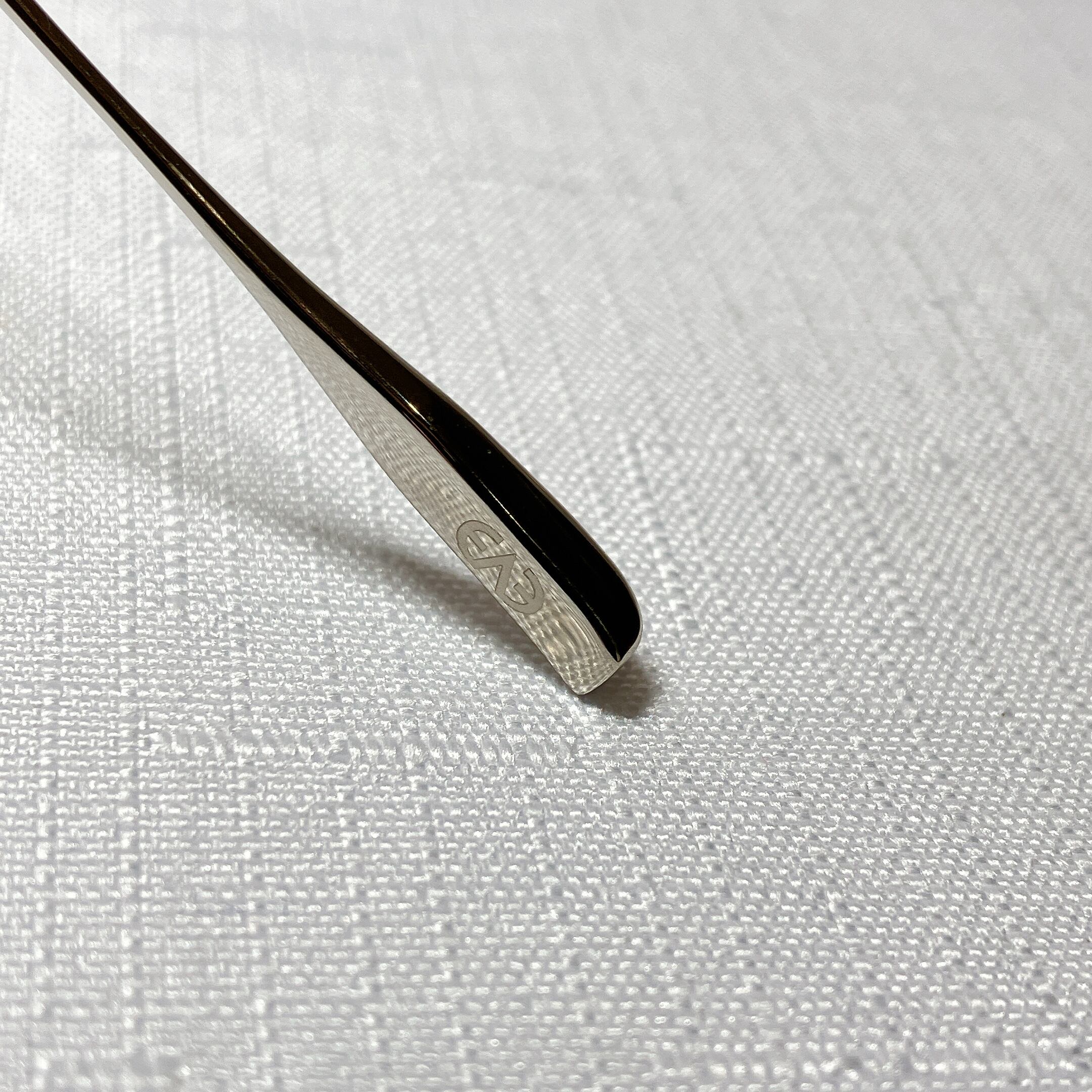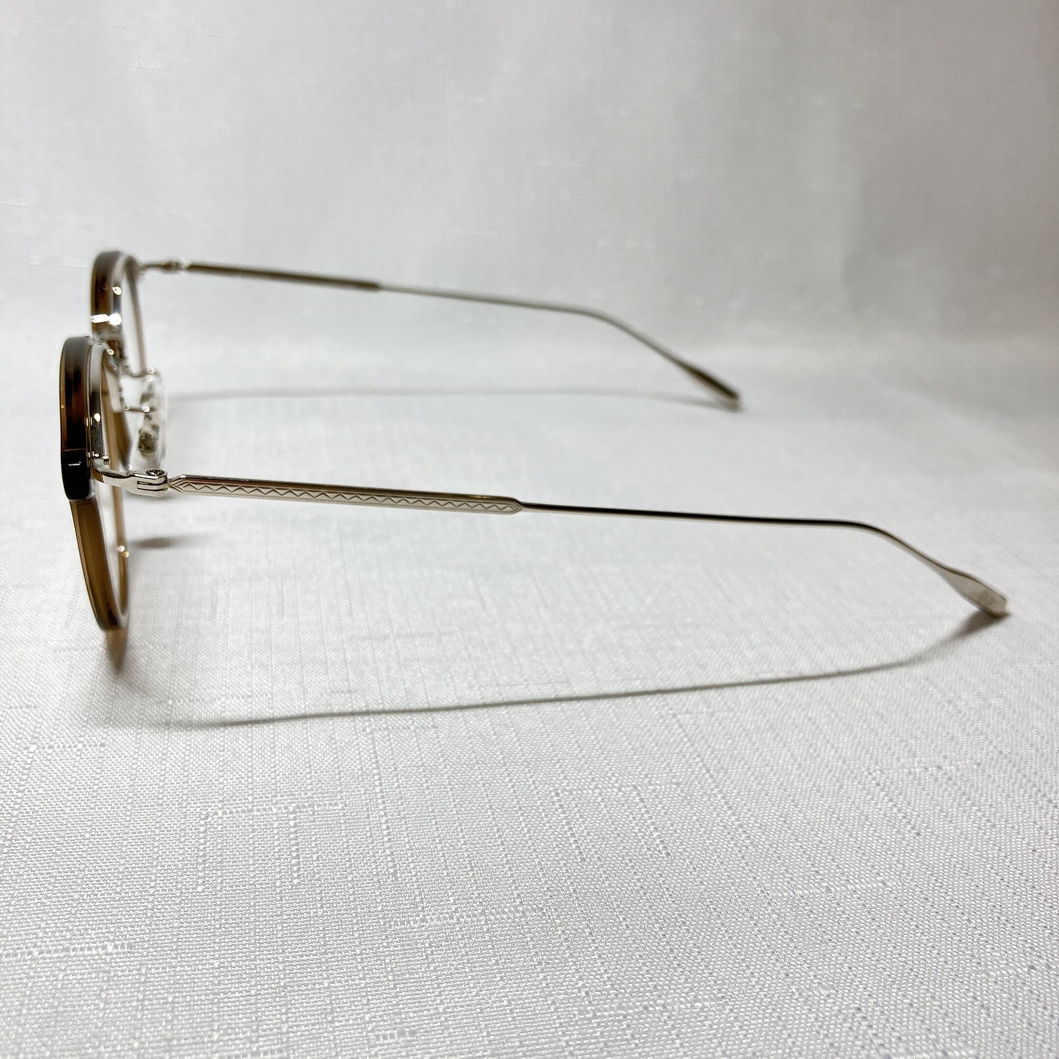 熟練の職人によって、ロー付けを行わずプレスでミル模様を鮮明に入れながら別々のパーツの様に見せた一体型トップバーに、プラスチックのリムを合わせたコンビネーションフレーム。