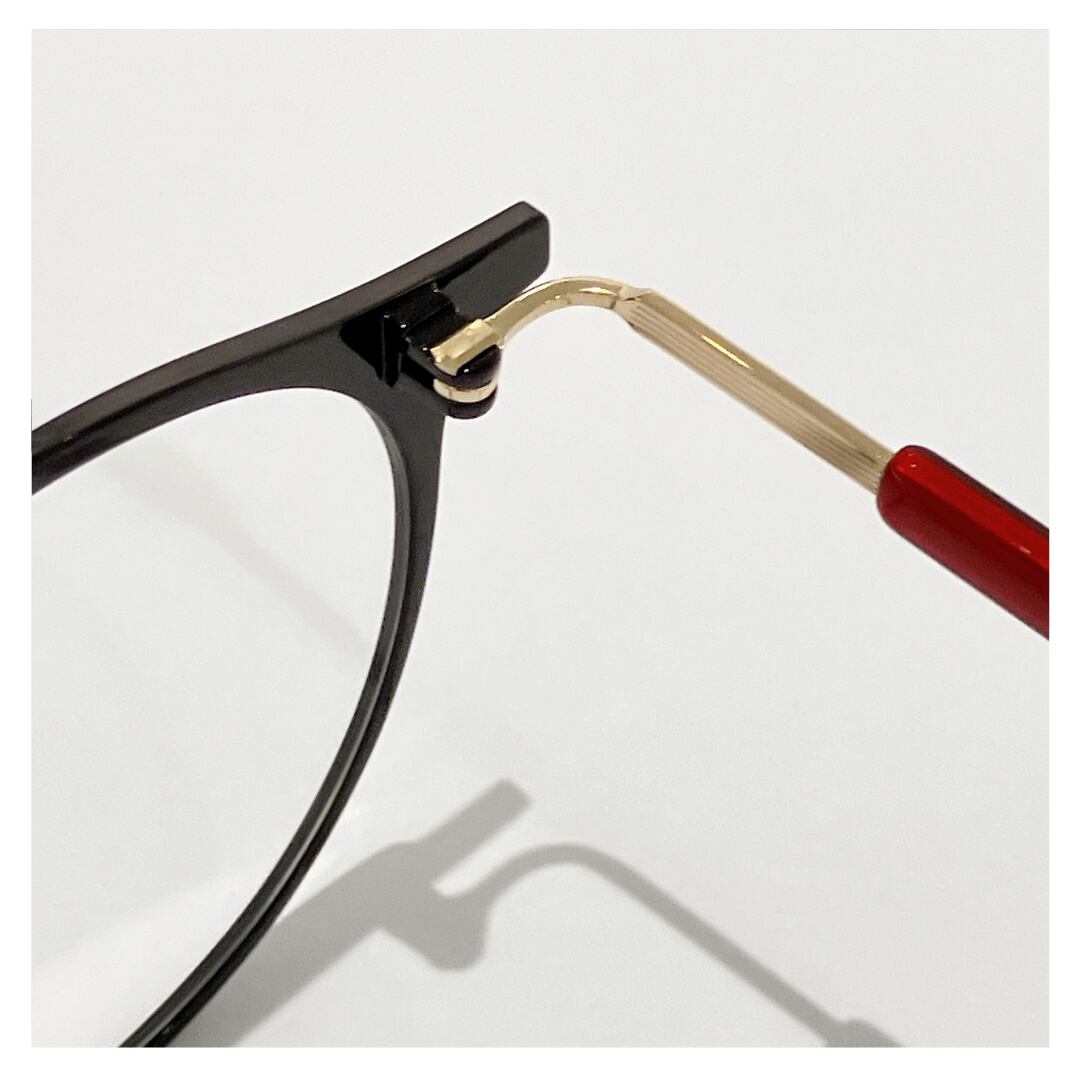 強度のあるチタンのシートメタルにβチタンを内包したアセテートテンプルを組み合わせ、しなやかな掛け心地を実現した。L字型の特殊な形状を有した丁番は、掛け心地の良さとオプティシャンによる調整のしやすさという目的を追求した結果、生まれた形状。 P21型のアセテートモダンは装用者の頭部に合わせ、オプティシャンによる調整(テンプル芯カットも可能)によりベストな掛け心地を具現化できる設計になっている。 小ぶりなボストンシェイプと強度も確保した特徴的なカラーリングが新鮮な印象。