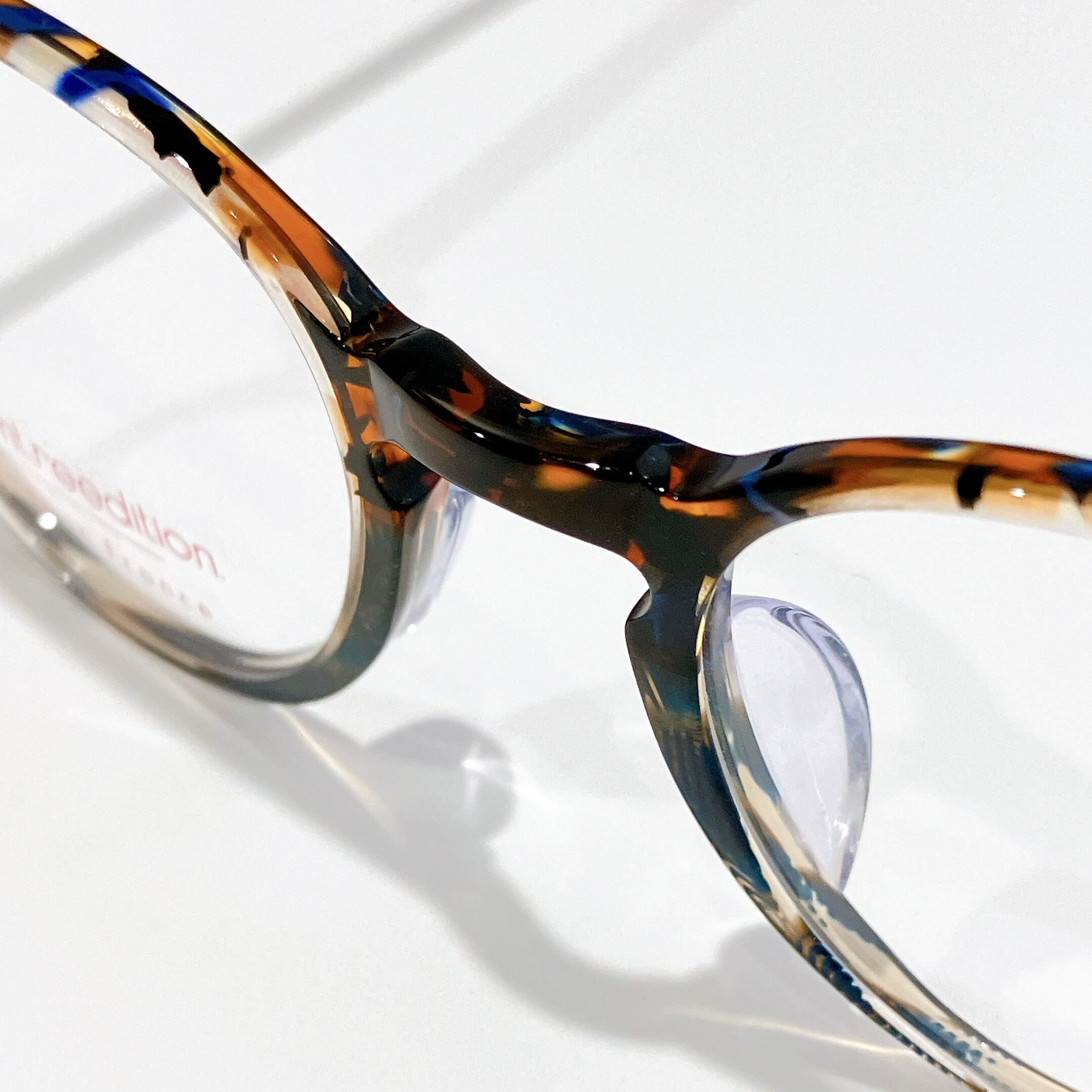 クラシックなフレームラインをベースに、繊細な柄や独自のカラーコンビネーションを取り入れることで、掛ける人の表情を華やかに引き立てます。