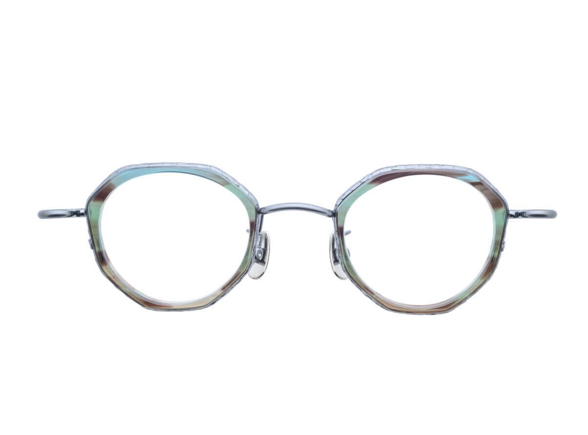 リムのアウトラインはパントゥベースの八角形、レンズシェイプは曲線的なパントゥで、ナチュラルさと個性を併せ持ったデザインです。