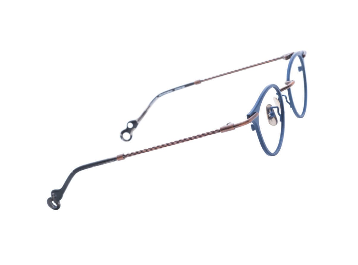 チタンの板抜きリムを、ぐいっとカーブしたユニークなブリッジが繋ぎます。
