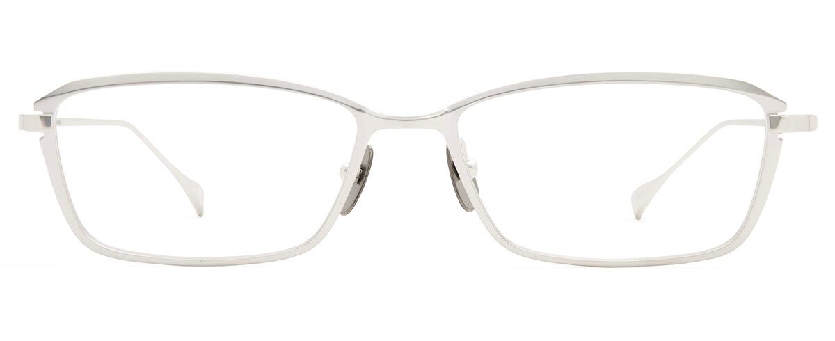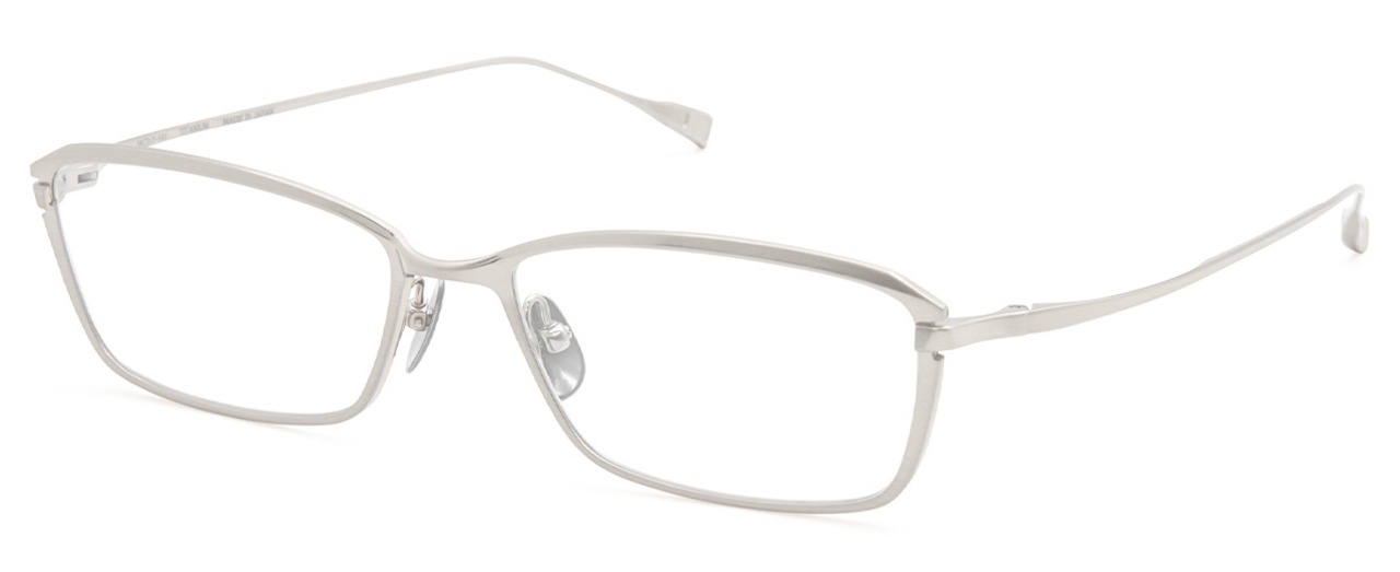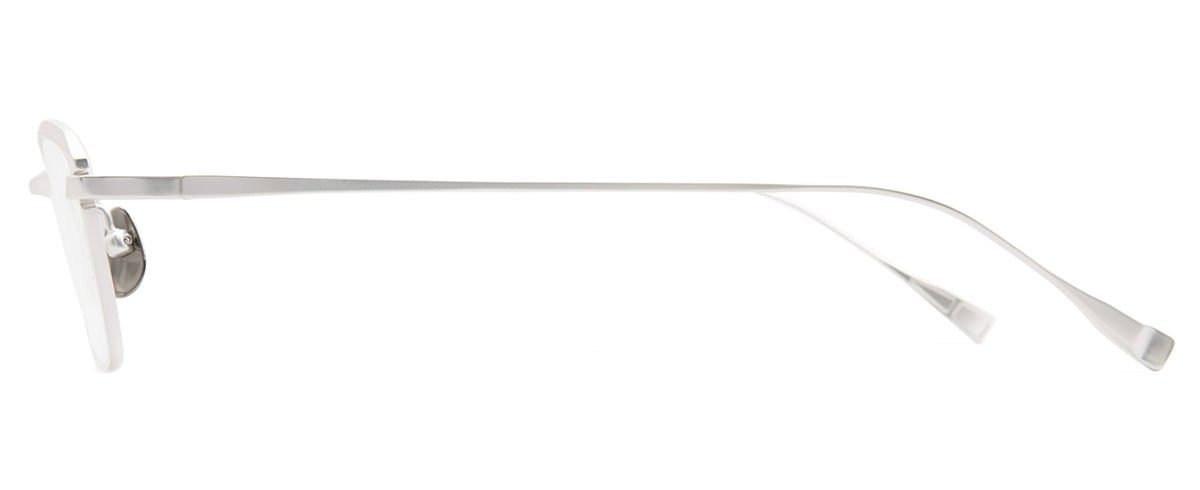 横幅を大きくもたせたLサイズのスクエアシェイプ。フロントはチタン板材をプレスと切削加工で丹念に作り上げ、特にフロント上部に施された斜め面カットはシャープで知的な印象を与えます。また、ヨロイの位置を一段下げることで程よいエッジと上質な雰囲気を兼ね備えた汎用性の高いモデルを追求しました。カラーリングは、メタルフレームの特性を活かしたソリッドな質感を表現。Col.05は透明感を追求した顔馴染みの良いホワイトです。