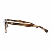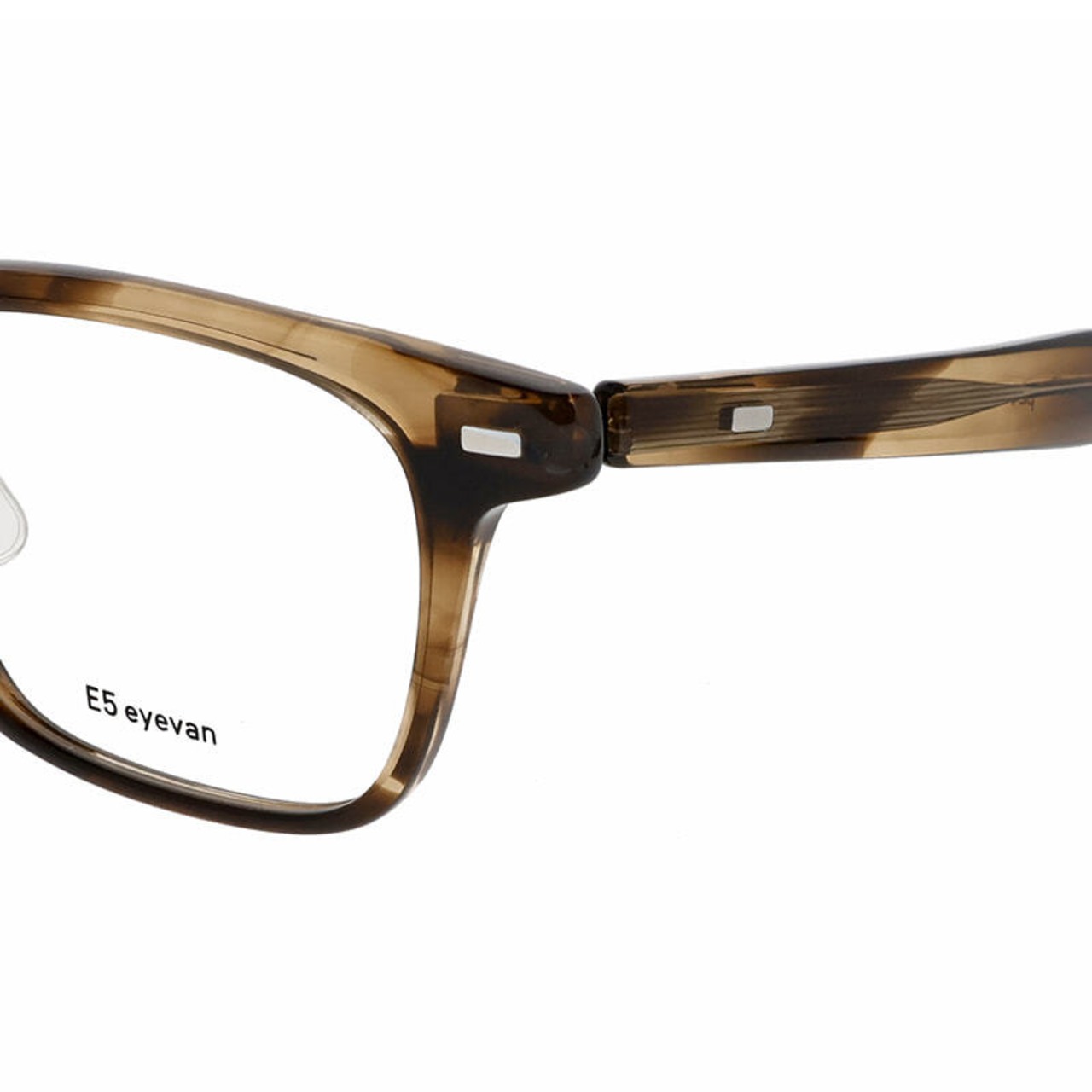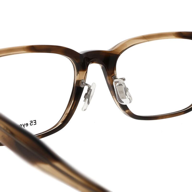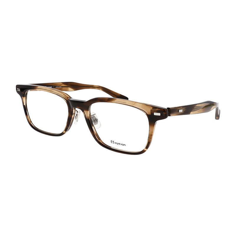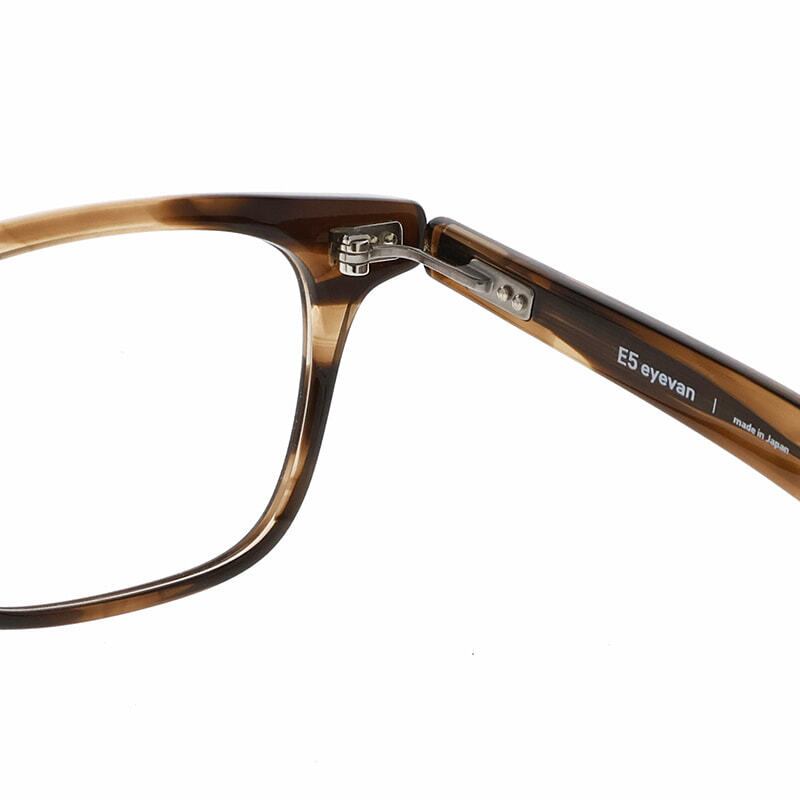 高密度で変形が少なく、経年変化がしにくい特殊なプラスチックであるHighcount acetateをフロントに使用した、ウェリントンスタイルのフレーム。E5のシグネチャーであるL字型の特殊な形状を有した丁番は、掛け心地の良さとオプティシャンによる調整のしやすさという目的を追求した結果、生まれた形状です。