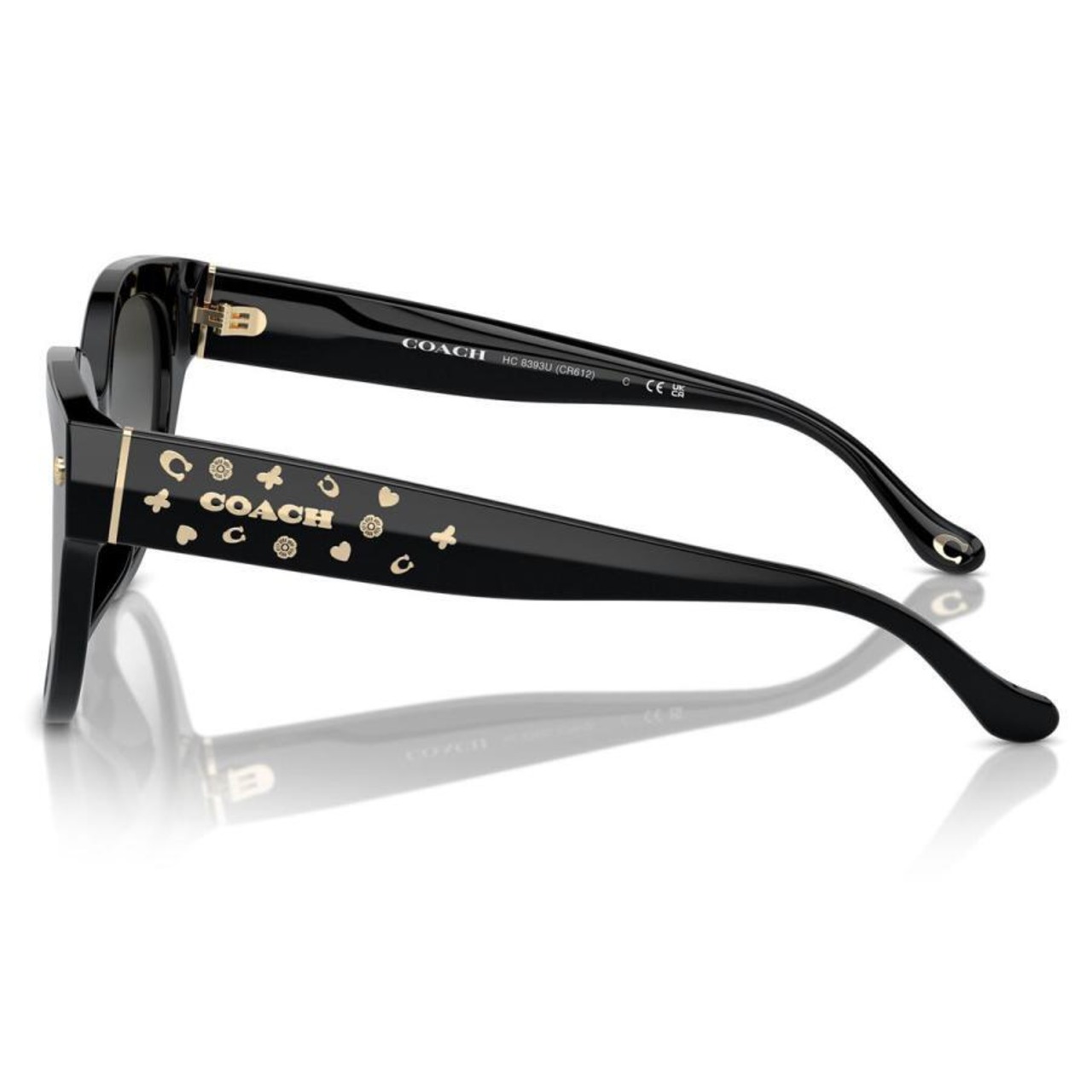 フロントに緻密に彫り込まれたティーローズのメタルが輝き、お顔を華やかに見せてくれます。太めサイズのテンプルには、花柄、ハート、蝶、そして頭文字「C」のモチーフが散りばめられ、COACHロゴが洗練されたアクセントに。