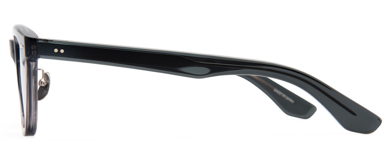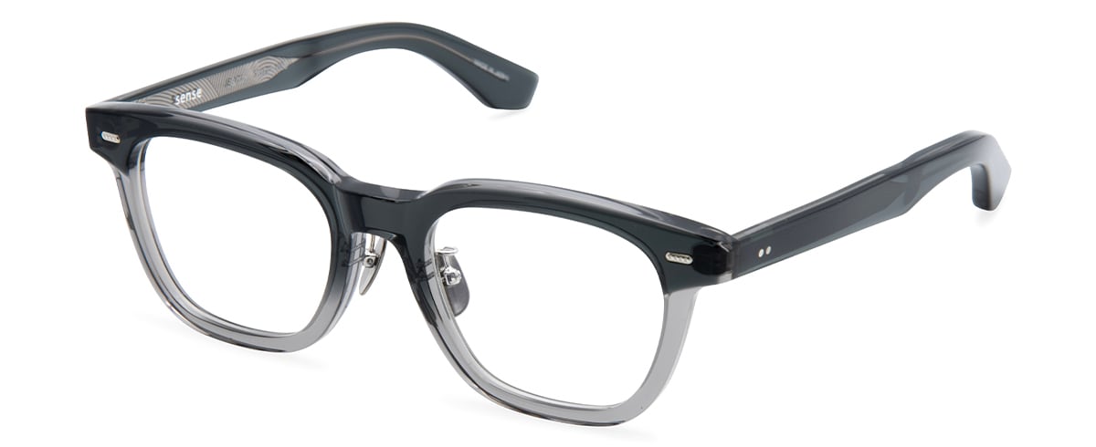 程よいボリューム感のあるLサイズのウェリントンタイプ。Col.02,04は二層生地の削り出しによるグラデーションカラーで自然な立体感を表現。ブリッジからヨロイにかけて厚みの抑揚をつけたフロントに加え細部に至るまでサイズバランスやシルエットを突き詰め、より目元を引き立たせるデザインに仕上げました。装着感にこだわったテンプルは、ヨロイ側3.5mmからテンプルエンドに向かって6mmへと厚みに抑揚をつけフレーム全体の比重バランスを考慮した設計になっており、見た目に反して軽やかな掛け心地です。特殊なブラスト加工を施したマイクロチタンパッドは汗でも滑りにくいマット仕様。枯山水を模したテンプル芯や、欄間などに使用される組子細工を模したフロントの飾鋲など、随所に緻密で繊細なsenseの世界観を体現しています。