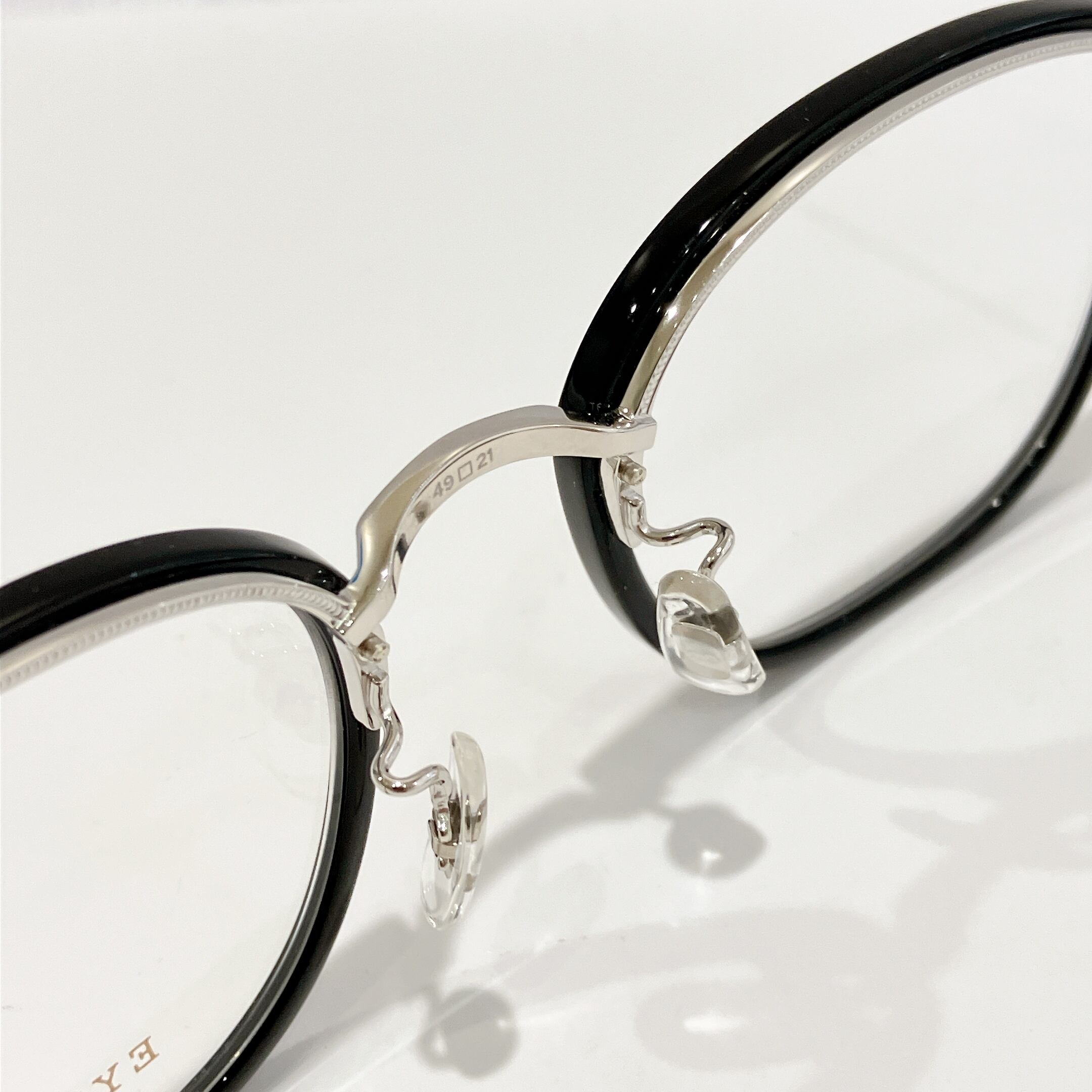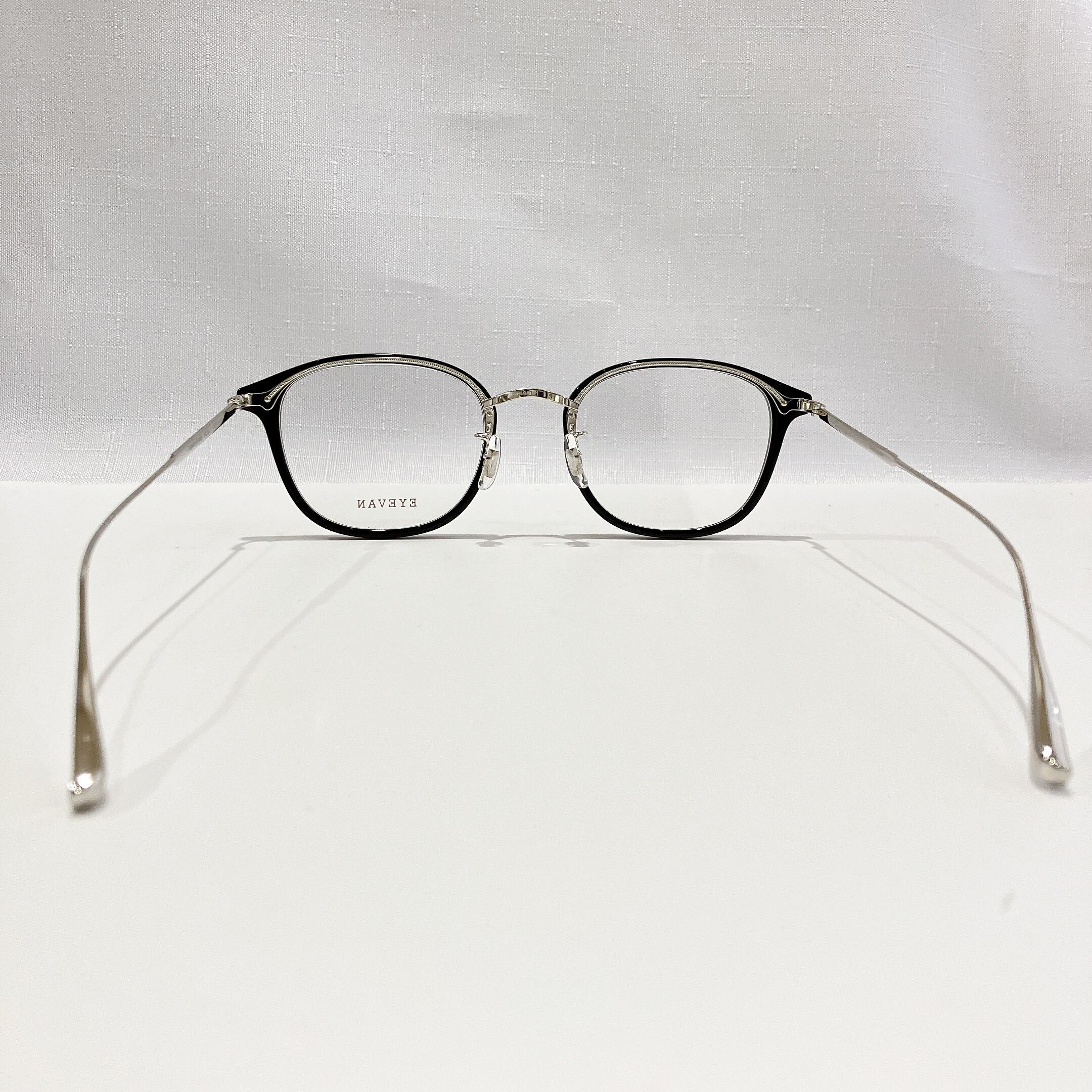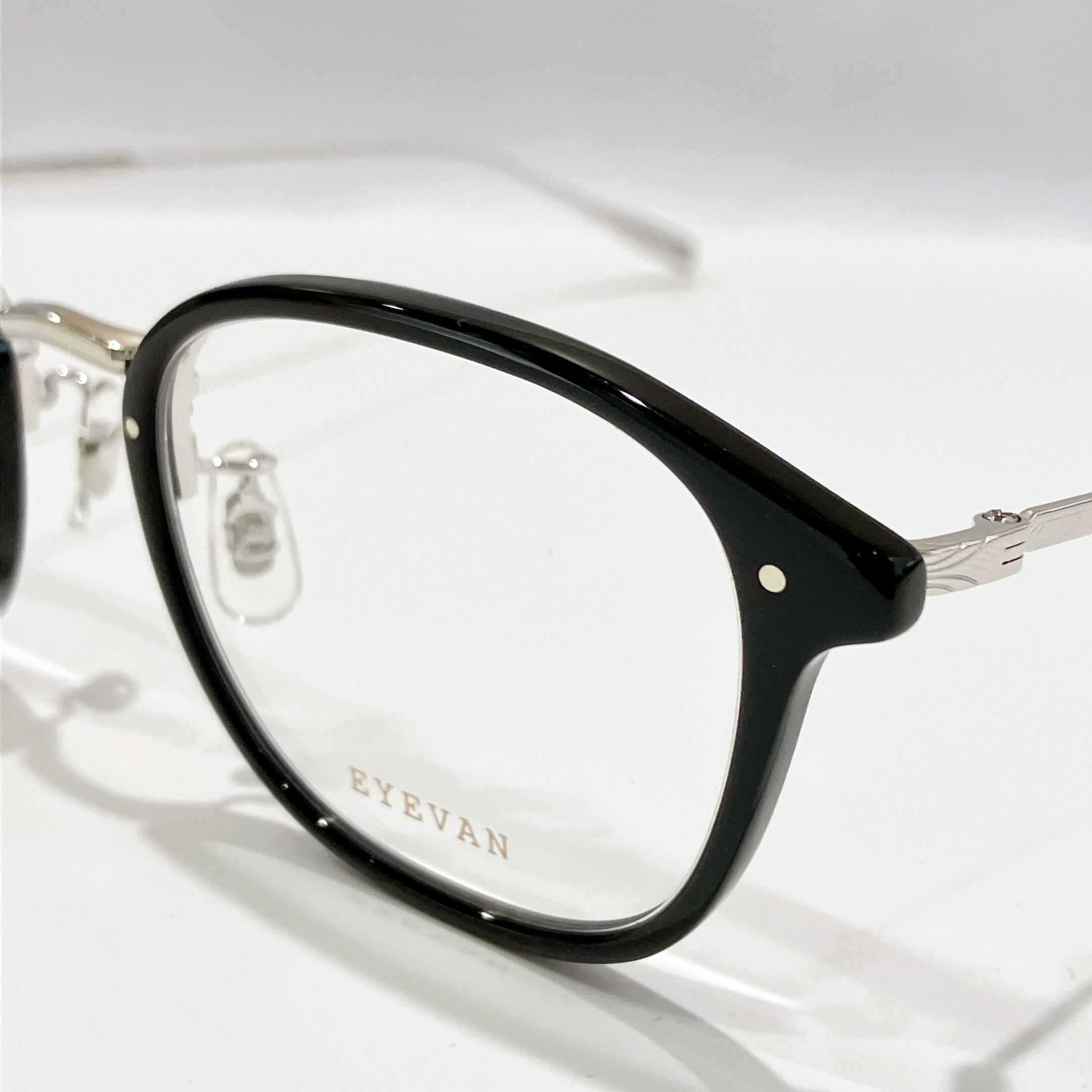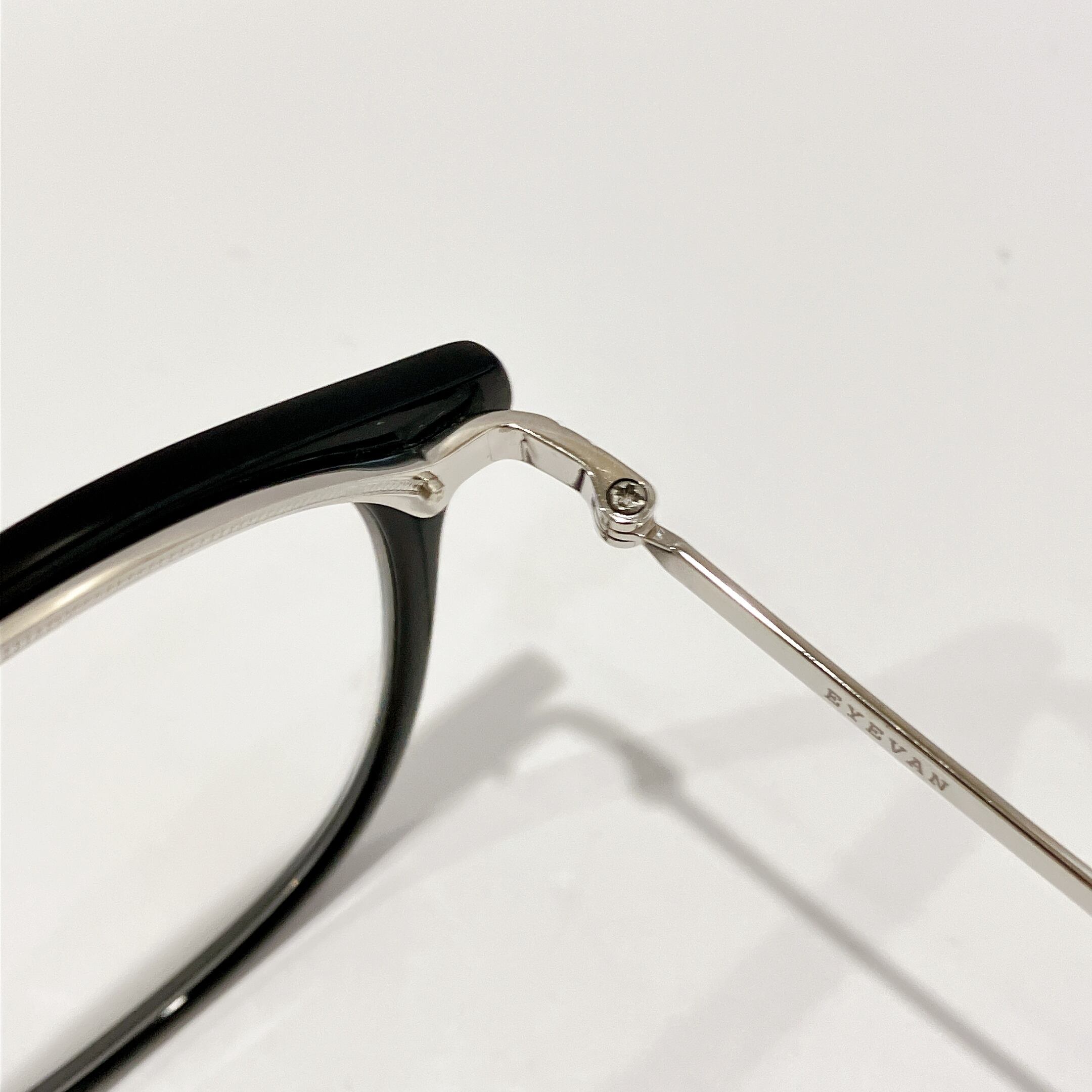 ウェリントン型のプラスチックのリムに、熟練の職人によって、ロー付けを行わずプレスでミル模様を鮮明に入れながら別々のパーツの様に見せた一体型トップバーを合わせたフレーム。ブリッジ デザインは、1930年代のスリーピースフレームから引用し、フロントのヨロイ部分からサイドにかけては1960年代にアメリカで流行していた「スピードライン」という線状のデザインを施すことで、時代の異なるVINTAGEのもつ空気感をEYEVAN流に1つのモデルで現代的に表現した。