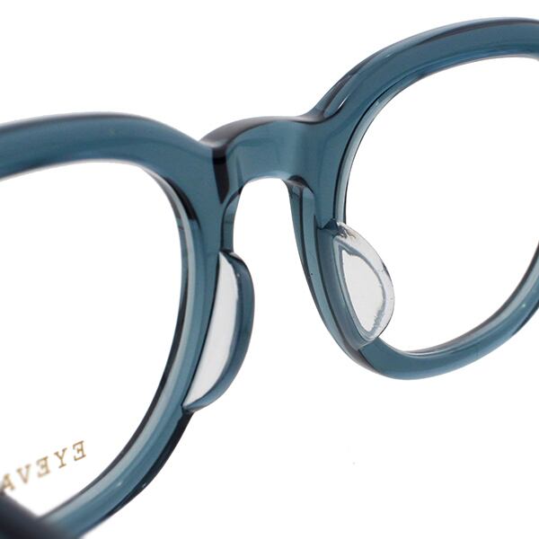 正面視やや厚みのあるウェリントンフロントに、1950年代の希少なフレンチヴィンテージに見られる上下のベベルカットが特徴的なテンプルを合わせたモデル。フロントには3PINかしめ丁番、テンプルには2PINかしめ丁番を合わせオーセンティックに仕上げた。
