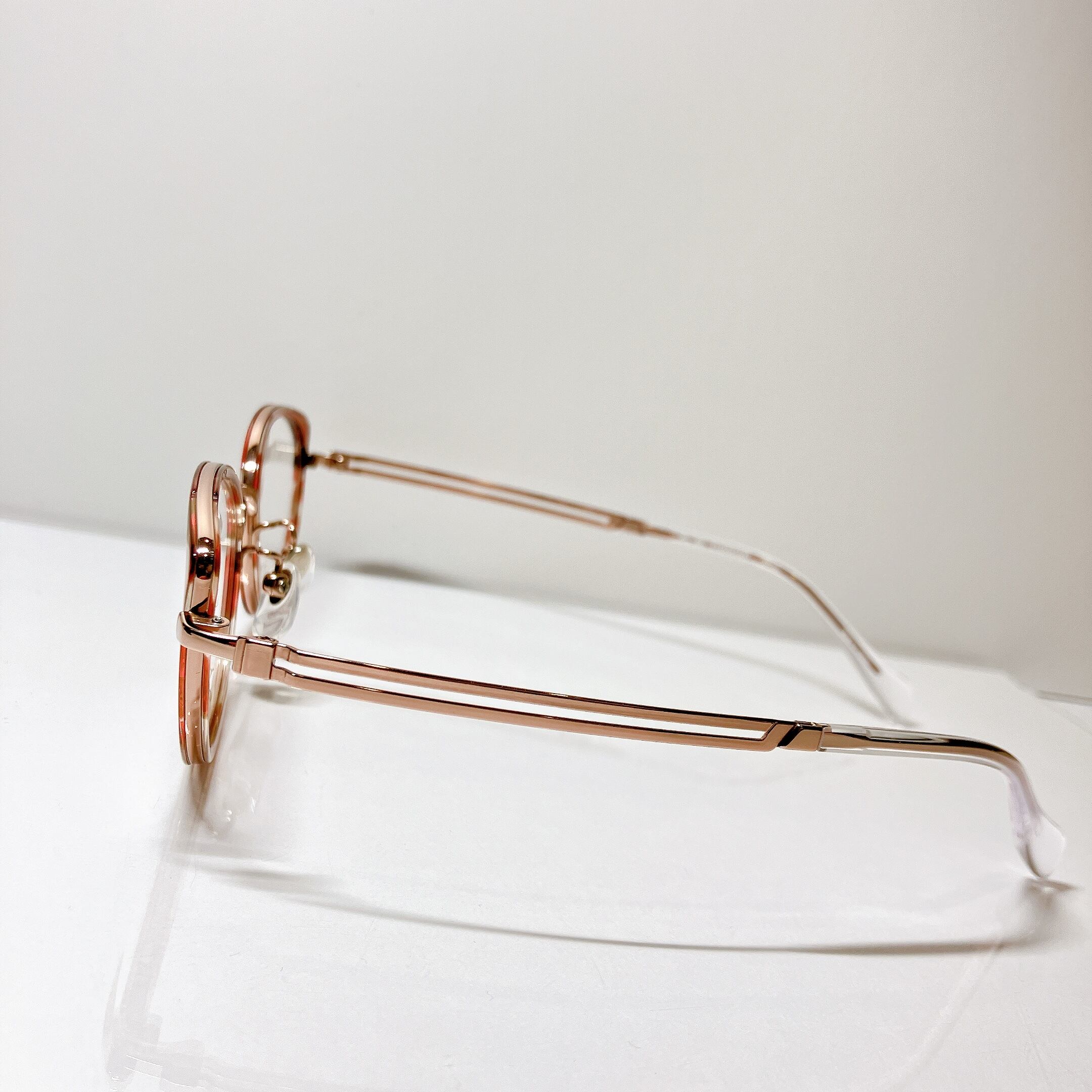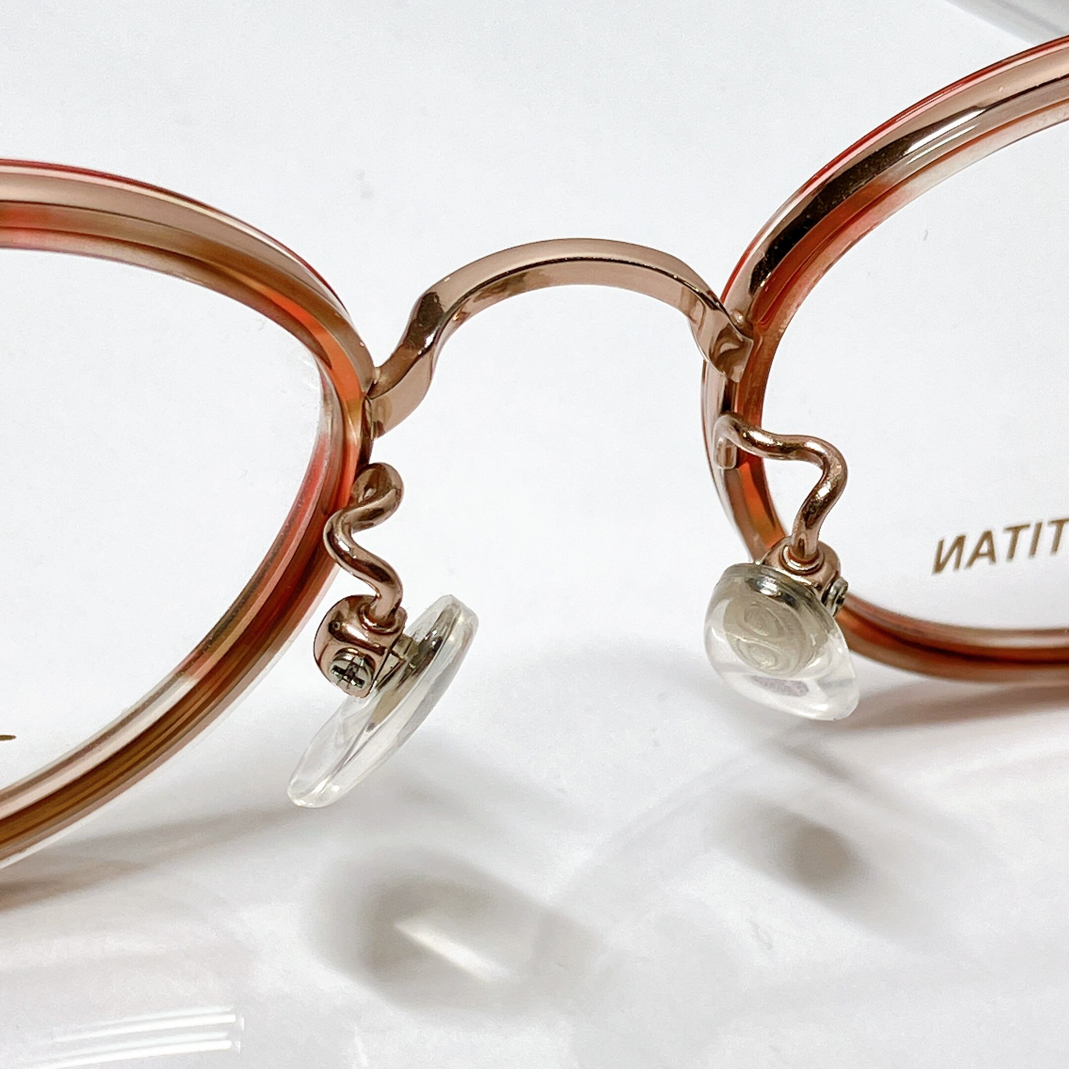おしゃれな女性に人気のコンビネーションフロントです。玉形の上部外側のネコ耳風アクセントがかわいい表情をつくります。アセテート生地は美しいイタリアメーカー、マツケッリ製です。メタルカラーはシンプルなブラック、ゴールド、ピンクゴールドだけでコーディネートしています。